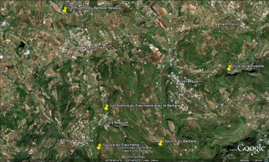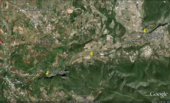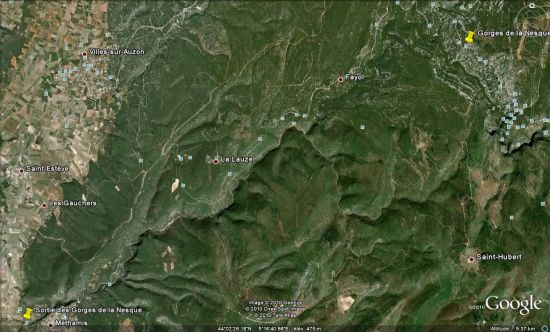 A partir de cet endroit , le ruisseau disparaît dans les gorges de la Nesque sur une distance de 25kms. Il est coucircuité par le systéme karstique; Les hydrogéologues lui ont donné le nom de " Pertes de la Nesque"; la riviére devient souterraine.