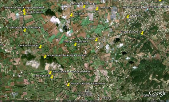 Le parcours du cours d'eau vers l'aval se succède de la rivière la Sorgue de Velleron, à la rivière l'Ouvéze,à Bédarrides, puis le Rhône à Sorgues, et la méditerranée à Port Saint Louis du Rhône.