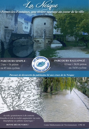 Cette année 2014, c’est sur le territoire de la Nesque et en particulier de Pernes-les-Fontaines que le CME et ses partenaires (la région Provence-Alpes-Côte d’Azur, le Département du Vaucluse, la mairie de Pernes) a choisi de se pencher pour la réalisation de ce nouveau topoguide de 23 pages; il vous propose une mine de renseignements qui vous méneront avec un parcours pédestre, un circuit cycliste à la découverte ou redécouverte du patrimoine de l'eau; les flashcodes vous donneront des informations complémentaires sous forme de vidéo, de son ou d’images.