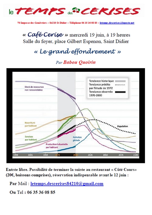 Vous êtes cordialement invités à participer au Café Cerise de mercredi 19 juin 2019, avec pour thème "Le Grand Effondrement" . Il sera présenté par Babou Quoirin et débutera à 19h dans la salle du foyer, derrière la mairie, à Saint Didier.