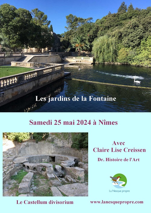 Découverte de la partie basse des jardins de la fontaine à Nîmes. Ils sont situés sur un magnifique lieu historique et naturel de 15 ha. Le thème de la matinée portera sur l’eau et l’ancien Augusteum : sanctuaire consacré à Auguste et à Nemausus. Vestiges du temple de Diane. Evocation du jardin XVIIIe et des usages de l’eau de la source au fil des temps. Aujourd’hui, c’est une oasis. Le lieu est classé parmi les 6 plus beaux jardins de France.