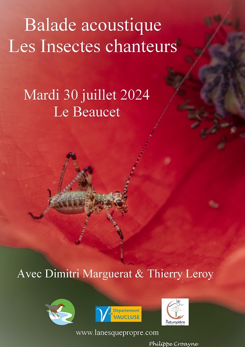 Dimitri Marguerat (Nesque Propre et Rando Oiseaux) et Thierry Leroy (Responsable scientifique du Naturoptère) vous proposent une balade acoustique de 18h à 23h au Beaucet. Nous partirons sur les traces des insectes chanteurs : Cigales, Criquets, Grillons, Sauterelles
