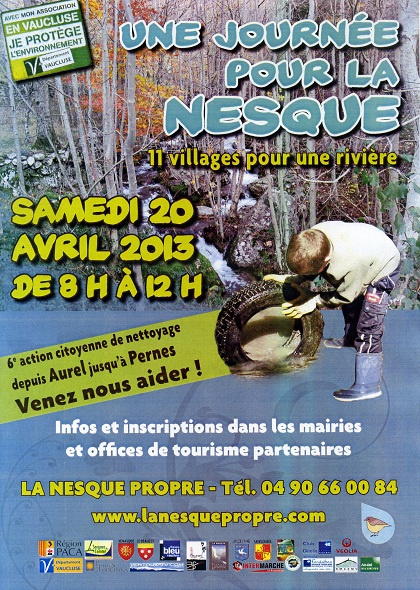 Portée depuis 2007, par une dynamique exceptionnelle, l’association « La Nesque Propre » va écrire une nouvelle page de son histoire, le samedi 20 Avril 2013. L’objectif de cette nouvelle action sera de poursuivre le boulot pour libérer la Nesque, ses affluents, ses ruisseaux, ses sources, et ses abords des incivilités récurrentes.