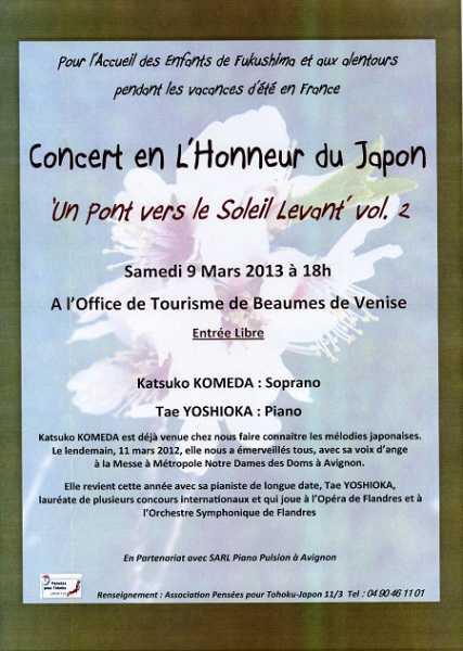 La présidente de l'association qui coordonne tout ça, la franco-japonaise Junko Takasé, organise un récital gratuit, avec une soprano et une pianiste japonaises. Ce sera la Samedi 9 mars prochain, à Beaumes de Venise. A 18H à l'office du tourisme de Beaumes de Venise.