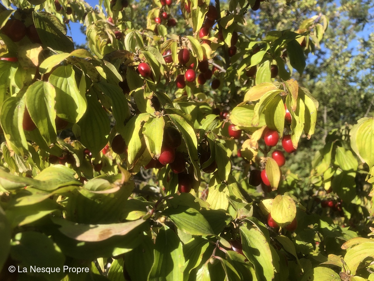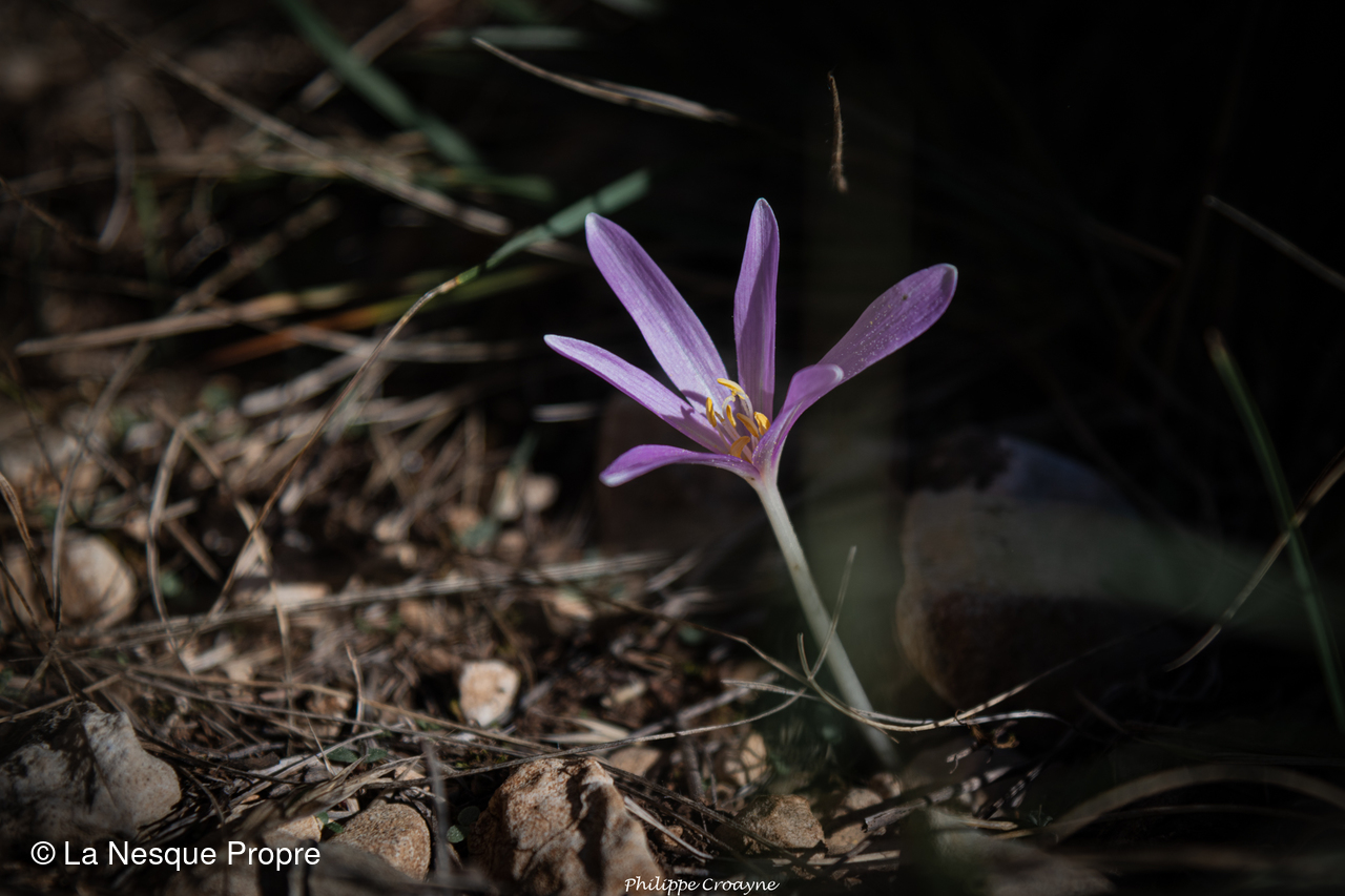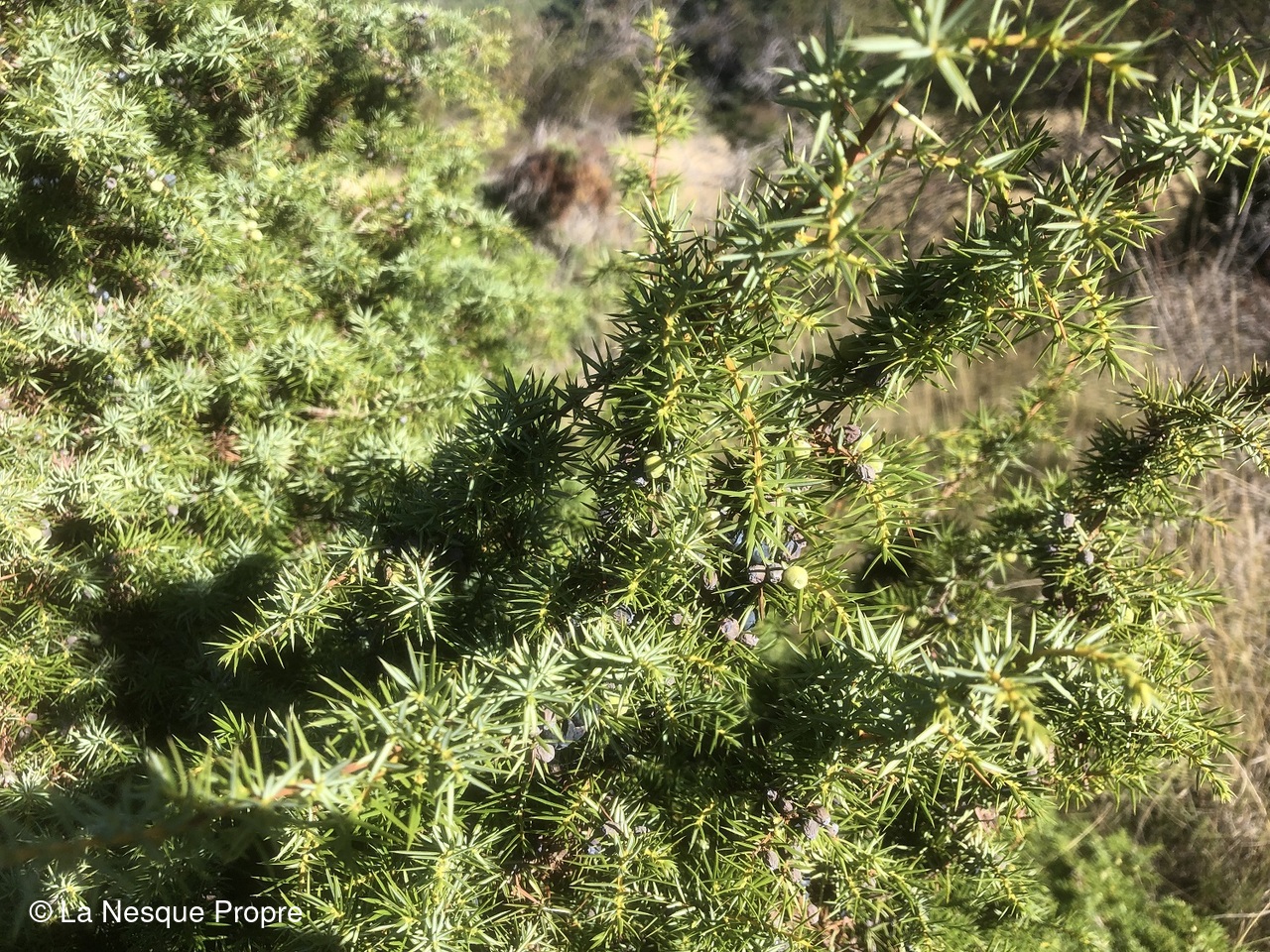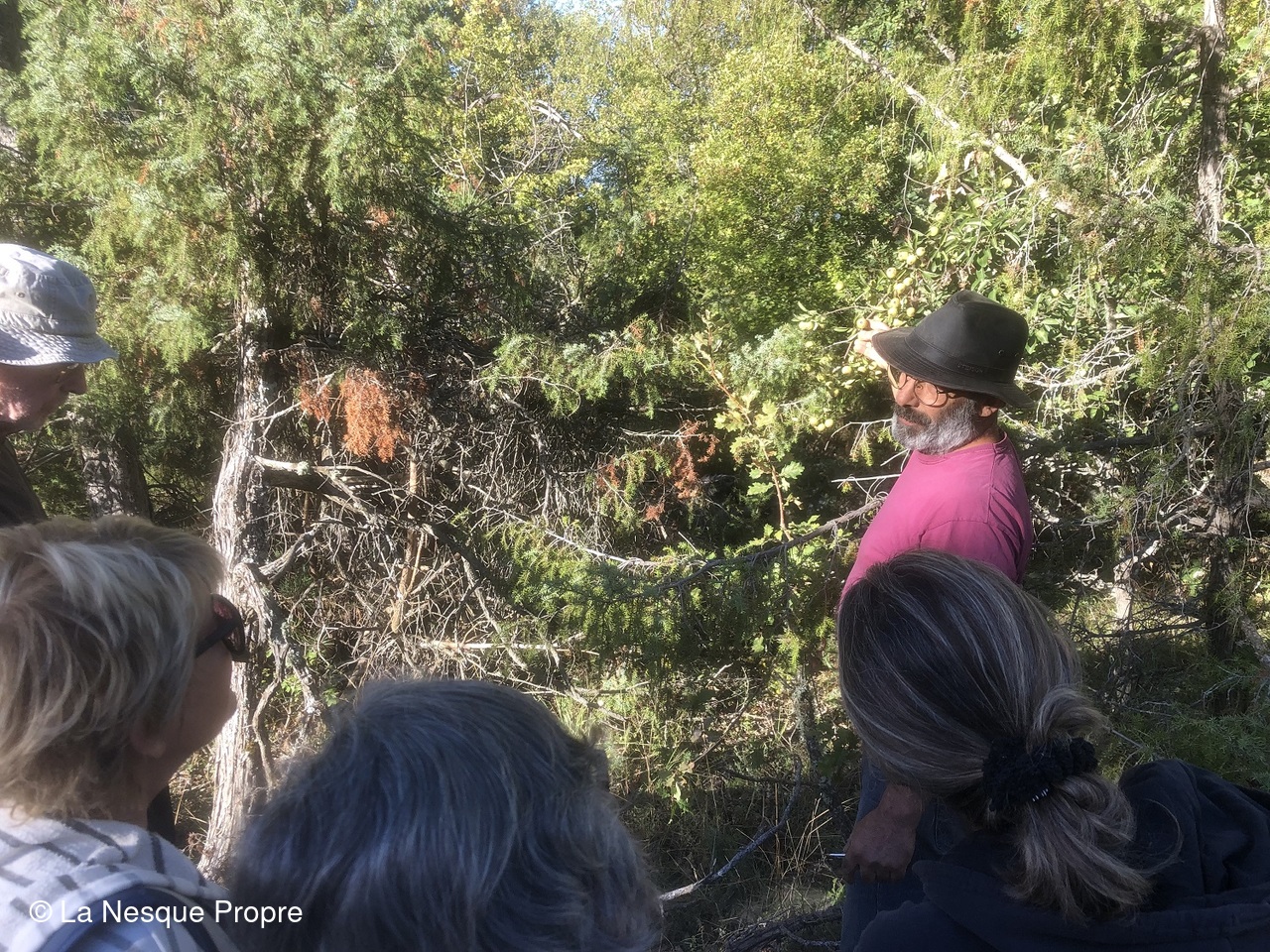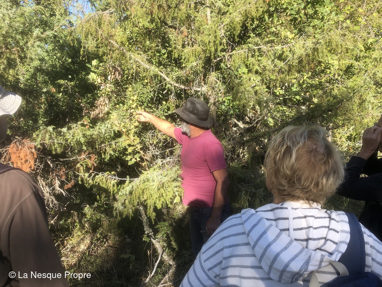 Ici, les conditions sont propices aux Cèdres de l’Atlas, aux Pins noirs d’Autriche (envahissants), aux Pins sylvestres qui se distinguent avec leur écorce orangée. Le milieu foisonne de couleurs avec les baies rouges de l’Alisier, savoureuses en confiture, les poiriers sauvages, le Cornouiller mâle avec ses drupes rouges comestibles, le Cerisier St Lucie, ancêtre de la griotte. Au sol, la Sarriette en fleurs dégage un parfum puissant et apaisant. Le Colchique des terrains secs est toxique. Ses longues feuilles pousseront après la floraison. Il côtoie une Immortelle. On repère, un petit arbuste touffu, le Fusain d’Europe dit « Bonnet de prêtre » avec ses jolis fruits dangereux. Trois espèces de genévriers poussent côte à côte. Ce n’est pas courant ! Le genévrier oxycèdre (Cade), le Genévrier commun, le Genévrier de Phénicie. On cueille quelques « baies » mûres du Genévrier commun pour les goûter. C’est bon pour la digestion, en tisane, en eau florale…