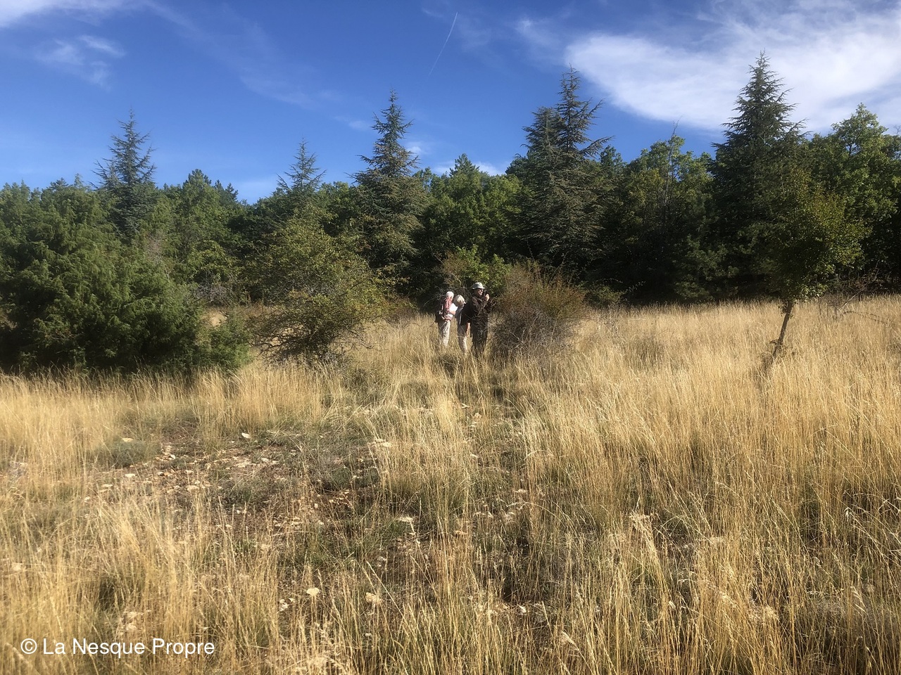On est à 897 m d’altitude, sur l’adret du Ventoux. Le versant est ensoleillé. Depuis des mois, l’eau est rare, le terrain est très sec.