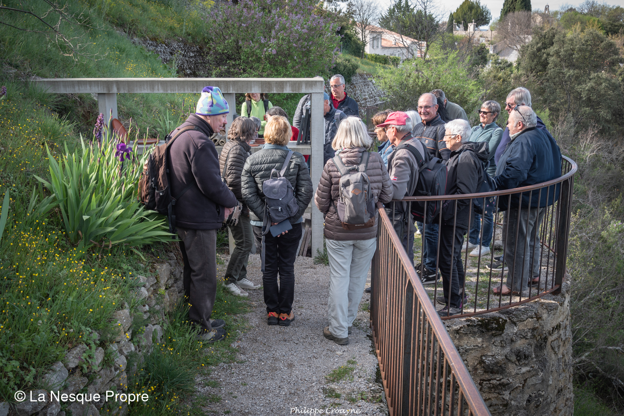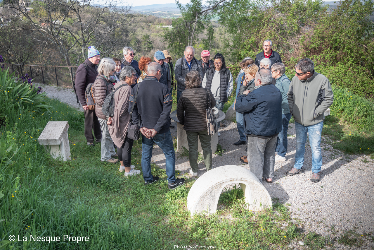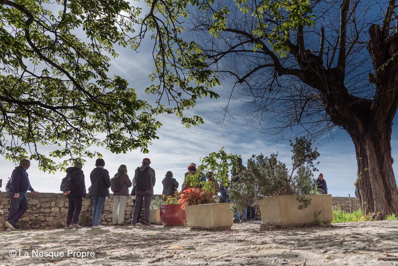 A travers le chemin des écritures, on a exploré un lieu chargé d’histoire, cher à Jean Giono. Tout est baigné de soleil et de silence. Au dessus de nous, un milan noir, tout juste arrivé d’Afrique tropicale, nous a offerts un numéro de vol plané dans la brise matinale. Ici, le point de vue est imprenable. Les paysages sont sublimes, particulièrement bigarrés. Au loin, à 360°, la Durance serpente avec « ses tresses », le Mercantour, le Luberon, la Montagne de Lure, le plateau de Valensole, le Mont Denier, le Buech, la Bléone…