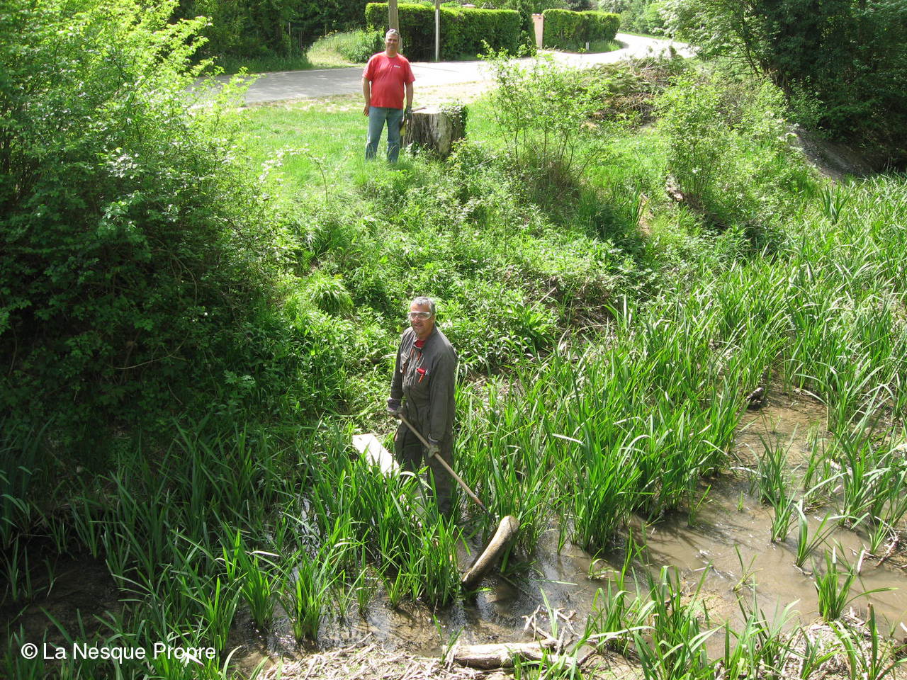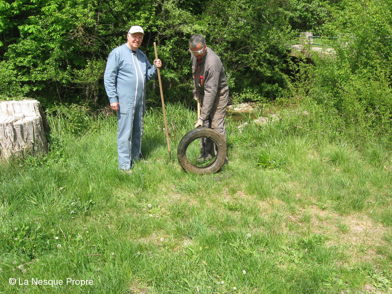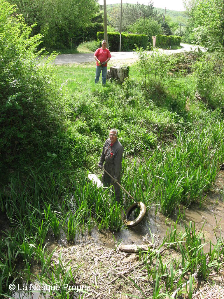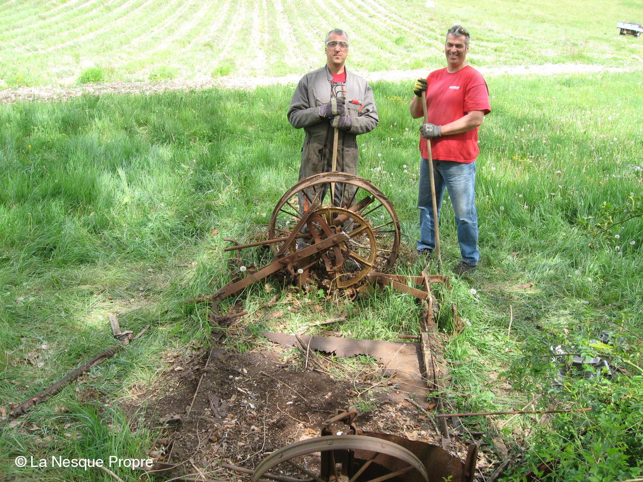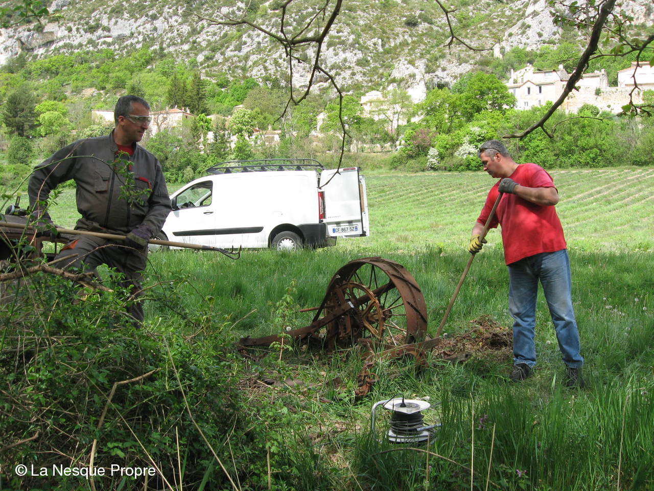 Aprés avoir extrait deux carcasses de voiture, une 4 CV renault, une Juva 4 et une lieuse des berges de la Nesque le samedi 3 mai gràce aux fréres Ughetto,une mini équipe composée des fréres Travaillon, de Maxime Ughetto et de Jean Pierre Saussac est revenue en renfort le jeudi 8 mai à Monieux pour finir le travail.