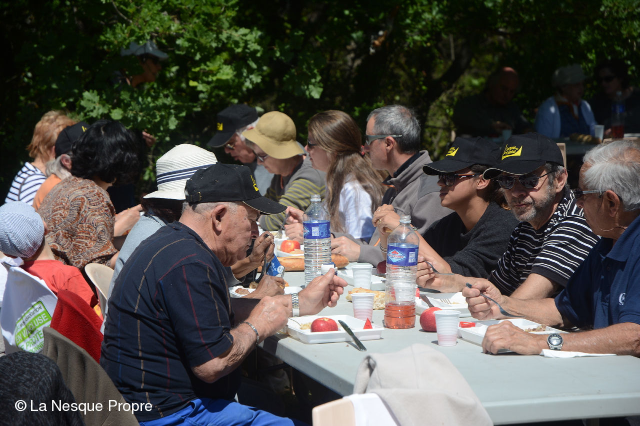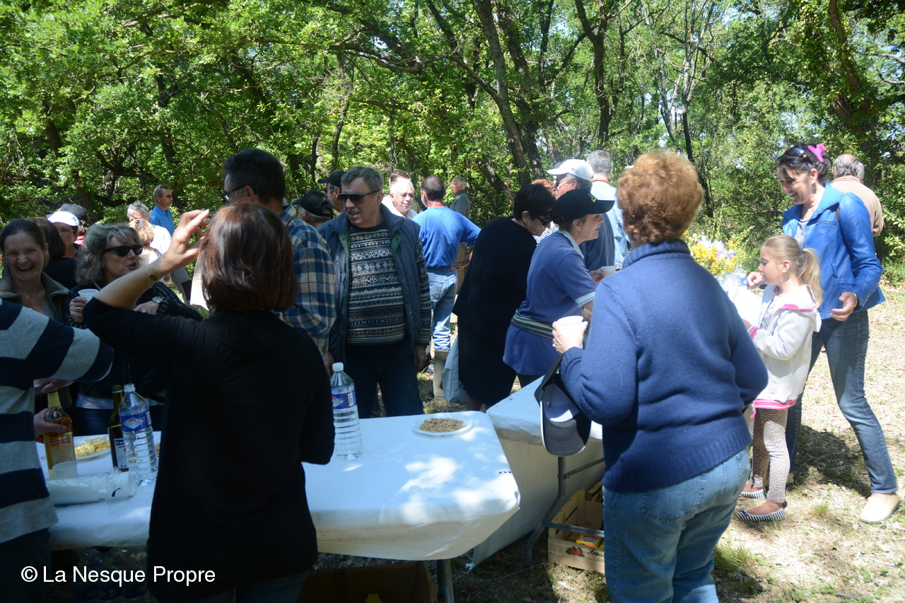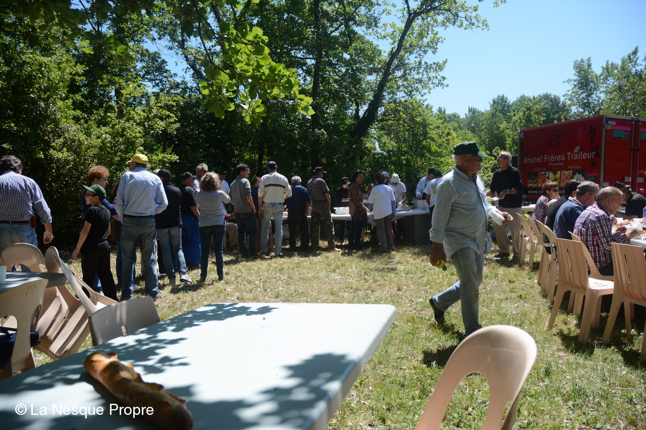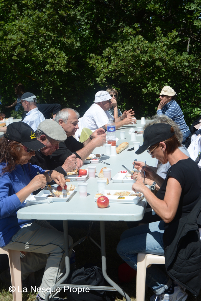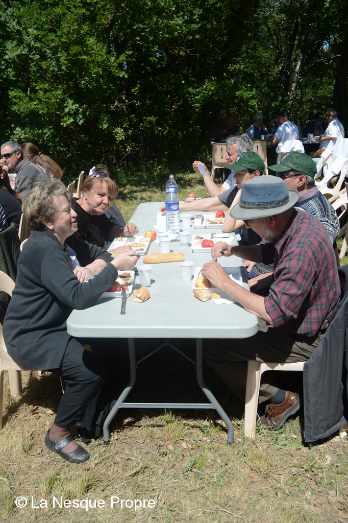 C'est la pause déjeuner " champêtre " à St Barth avec une ambiance du tonnerre autour de l'apéro offert par Intermarché de pernes les fontaines suivi d'un délicieux repas préparé par la maison Brunet Traiteur, avec épaule d'agneau confite accompagnée de riz aux quatre légumes , fromage, pomme juliette bio de la ferme Carle Berger d'Althen les paluds, le café , le tout arrosé de côtes du Ventoux rouge, rosé et blanc du domaine St Sauveur à Aubignan.